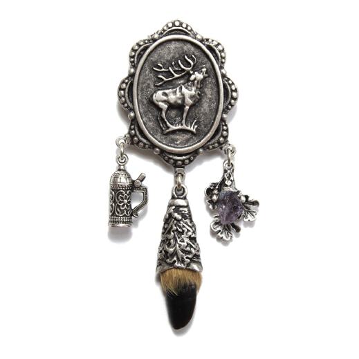 Ein beeindruckender Blickfang ist das Steck Charivari "Rehlein" mit einem wunderschönen Hirschmotiv, einem typisch bayerischen Maßkrug, einer edlen Rehzehe elegant gefasst und einem kleinen Edelstein Amethyst (Schutzstein) in einer besonders hübschen Eichblattfassung. Nichts unterstreicht die Persönlichkeit eindrucksvoller als ein extravagantes Trachtenaccessoire!