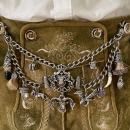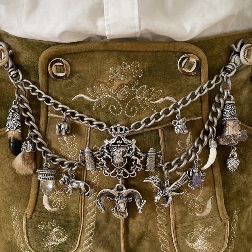 So ein extravagantes Charivari hat sonst keiner und ist unter Garantie ein Hingucker. Zwei matt versilberte massive Gliederketten mit 11 Anhänger: Dackel- und Wildsaukopf in der oberen Kette, edle Rehzehe in großartiger Fassung, Hasenkralle (Glücksbringer), Edelstein Bergkristall (Stein für Kraft & Energie) naturbelassen, kraftvoller Löwe, tolles Bayernwappen eingerahmt von zwei Maßkrügen als zentrales Mittelstück, markanter Widderkopf, auffallend schöner Greifvogel, feiner Edelstein Amethyst (Schutzstein) naturbelassen in Eichblatt-Fassung, seltener Fuchszahn und Rehbockrose (Verdickung am unteren Ende des Gehörns) mit einer Hopfendolde. Einfach an den äußeren Knöpfen der Lederhose befestigen - fertig ist der trendige Lederhosenschmuck!