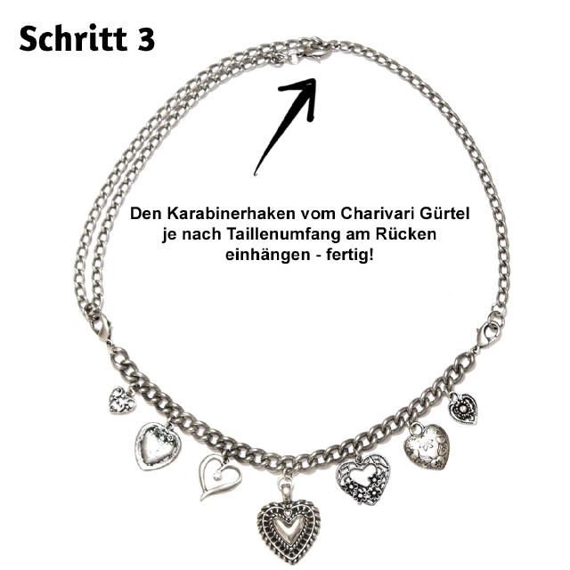 Mit dem Gürtel sitzt das Charivari perfekt am Dirndl. Beschreibung und Video, wie der Charivari Gürtel funktioniert weiter unten.