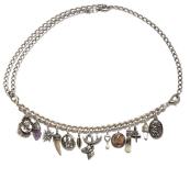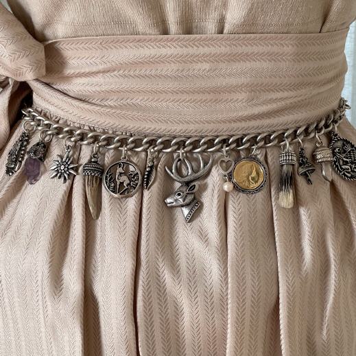 Charmant, feminin und elegant zugleich ist dieses Gürtel Charivari "Hirsch Fritzi" mit 13 zauberhaften Anhängern: edle Ludwig Medaille, kleiner Edelstein Amethyst (Schutzstein) naturbelassen, entzückendes Edelweiß, filigrane Rehbockspitze, Rehkitzmotiv, Buchenblatt mit einem Strass Stein verziert (Buche symbolisiert den Baum des Lebens), überaus hübsches Hirschgeweih als zentrales Mttelpunkt und Hingucker, zartes Herzerl mit einer Perle, stilvolle Maria Theresia Münze in roségold, kleiner Bart aus echtem Dachshaar, Dirndl, kleiner Edelstein Bergkristall geschliffen und tolles Bayernwappen. Sie werden begeistert sein und sich in das Gürtel Charivari "Hirsch Fritzi" sofort verlieben!