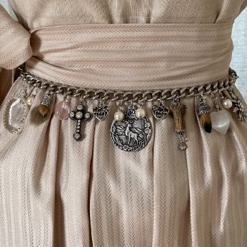 Dieses Problem hat der Charivarigürtel gelöst. Die Idee ist genial. Die Charivari Kette mit den Anhängern wird nicht in das Band der Dirndlschürze eingehängt, sondern in den Charivarigürtel. Der Charivarigürtel ist eine Gliederkette, ebenso versilbert wie die Charivari Kette und liegt um die Taille am Rücken. Damit der Charivarigürtel - für Konfektionsgröße XS bis XXL - perfekt sitzt, hat er eine Länge von 55-95 cm und kann je nach Taillenumfang flexibel angepasst werden.