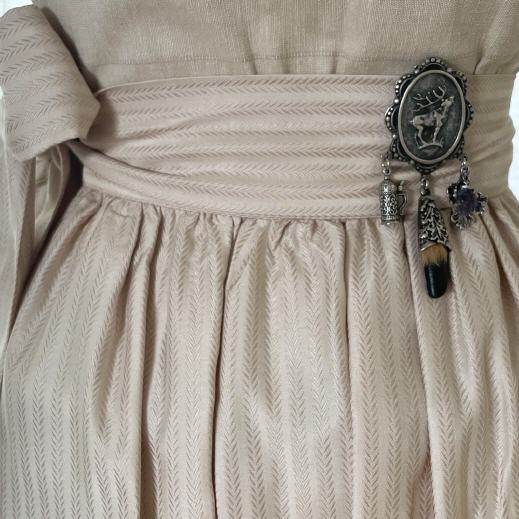 Steck Charivari ist ein besonderes Schmuckstück für die Dirndlschürze. An der Rückseite ist eine Klammer, mit der das Steck Charivari am Schürzenband der Dirndlschürze (auf der gegenüberliegenden Seite von der Dirndlschleife) befestigt wird.