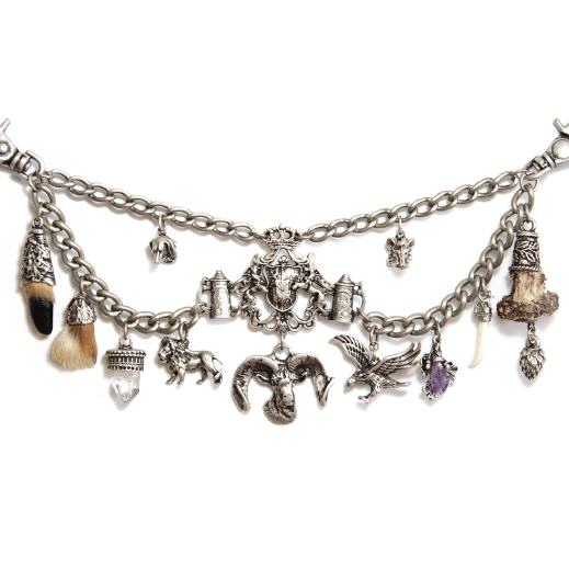So ein extravagantes Charivari hat sonst keiner und ist unter Garantie ein Hingucker. Zwei matt versilberte massive Gliederketten mit 11 Anhänger: Dackel- und Wildsaukopf in der oberen Kette, edle Rehzehe in großartiger Fassung, Hasenkralle (Glücksbringer), Edelstein Bergkristall (Stein für Kraft & Energie) naturbelassen, kraftvoller Löwe, tolles Bayernwappen eingerahmt von zwei Maßkrügen als zentrales Mittelstück, markanter Widderkopf, auffallend schöner Greifvogel, feiner Edelstein Amethyst (Schutzstein) naturbelassen in Eichblatt-Fassung, seltener Fuchszahn und Rehbockrose (Verdickung am unteren Ende des Gehörns) mit einer Hopfendolde. Einfach an den äußeren Knöpfen der Lederhose befestigen - fertig ist der trendige Lederhosenschmuck!